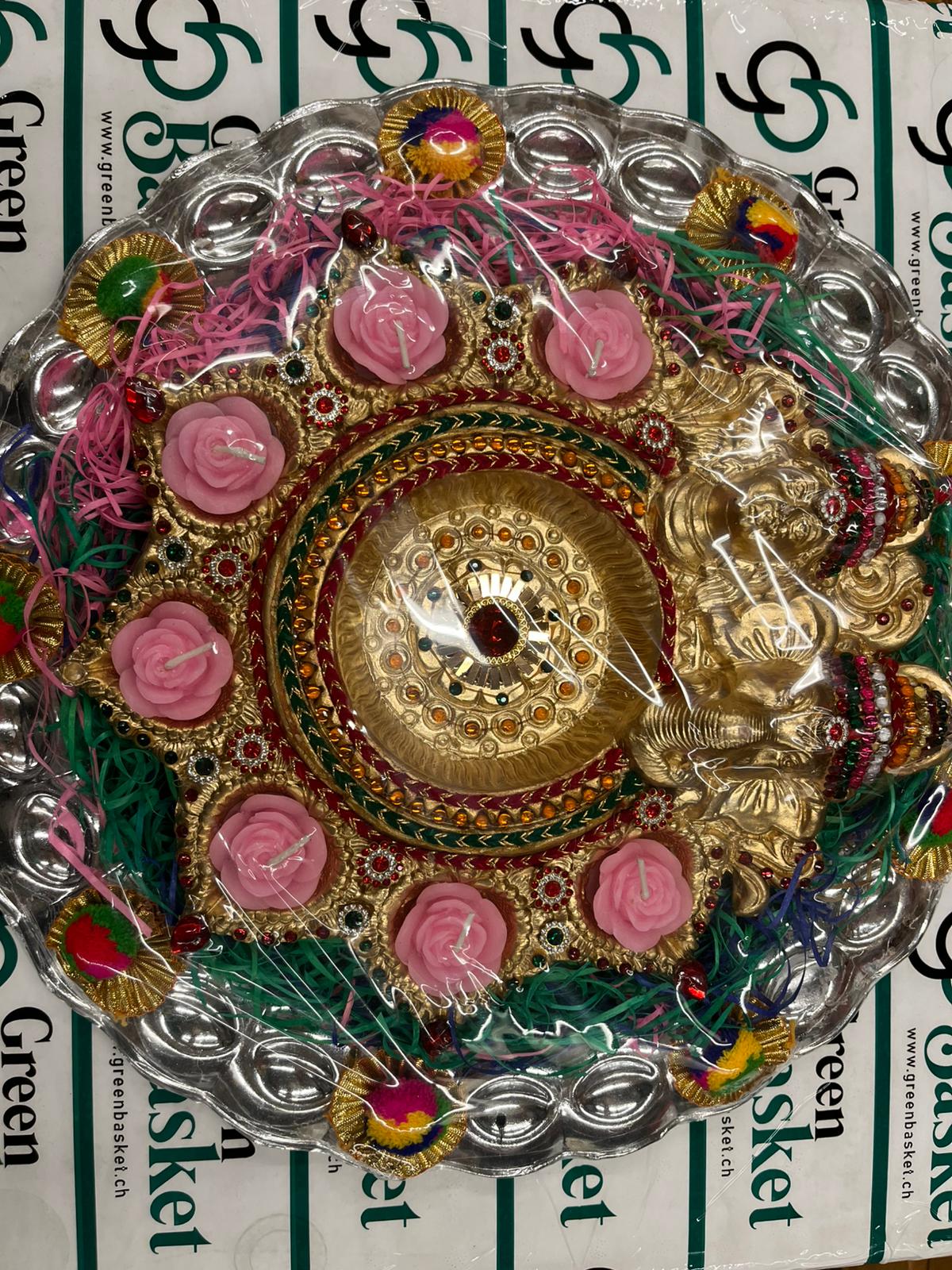 Introducing our exquisite Diya Thali with seven pink, rose-shaped candles. Decorated with opulent gold and multicoloured crystals. This captivating set is the perfect centrepiece for your Diwali celebrations. Light up your home with elegance and style. Order now to make your celebrations bright and memorable!
