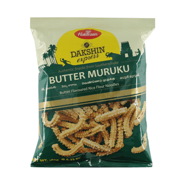 Haldirams Dakshin Express Butter Muruku is an Authentic snack from Southern India. It is a buttered flavoured rice flour noodles that contains milk and sesame components. Ingredients: Rice flour, vegetable oil, butter, split chickpeas, chickpeas flour, sesame, salt, cumin powder, & Asafoetida.