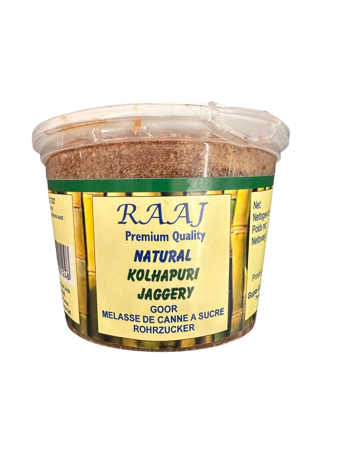 Jaggery, or gur, is a type of unrefined cane sugar. It’s light brown in color and soft to the touch. It has a delicious sweet taste and is considered by many to be a healthier alternative to white sugar. You can break it into small pieces and add it to tea or other beverages.