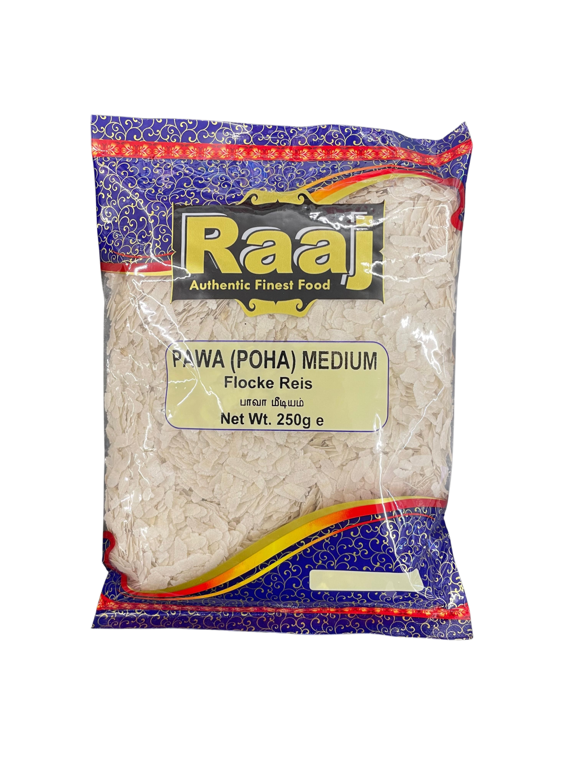 Poha Medium Rice is a type of rice that has been flattened into dry white flakes. It is popular in India and is often eaten both raw and cooked. Poha can also be called beaten rice. It is used to make snacks or fast food. You can enjoy it raw by combining it with brown sugar, or you can deep fry it and combine it with spices, nuts and raisins.