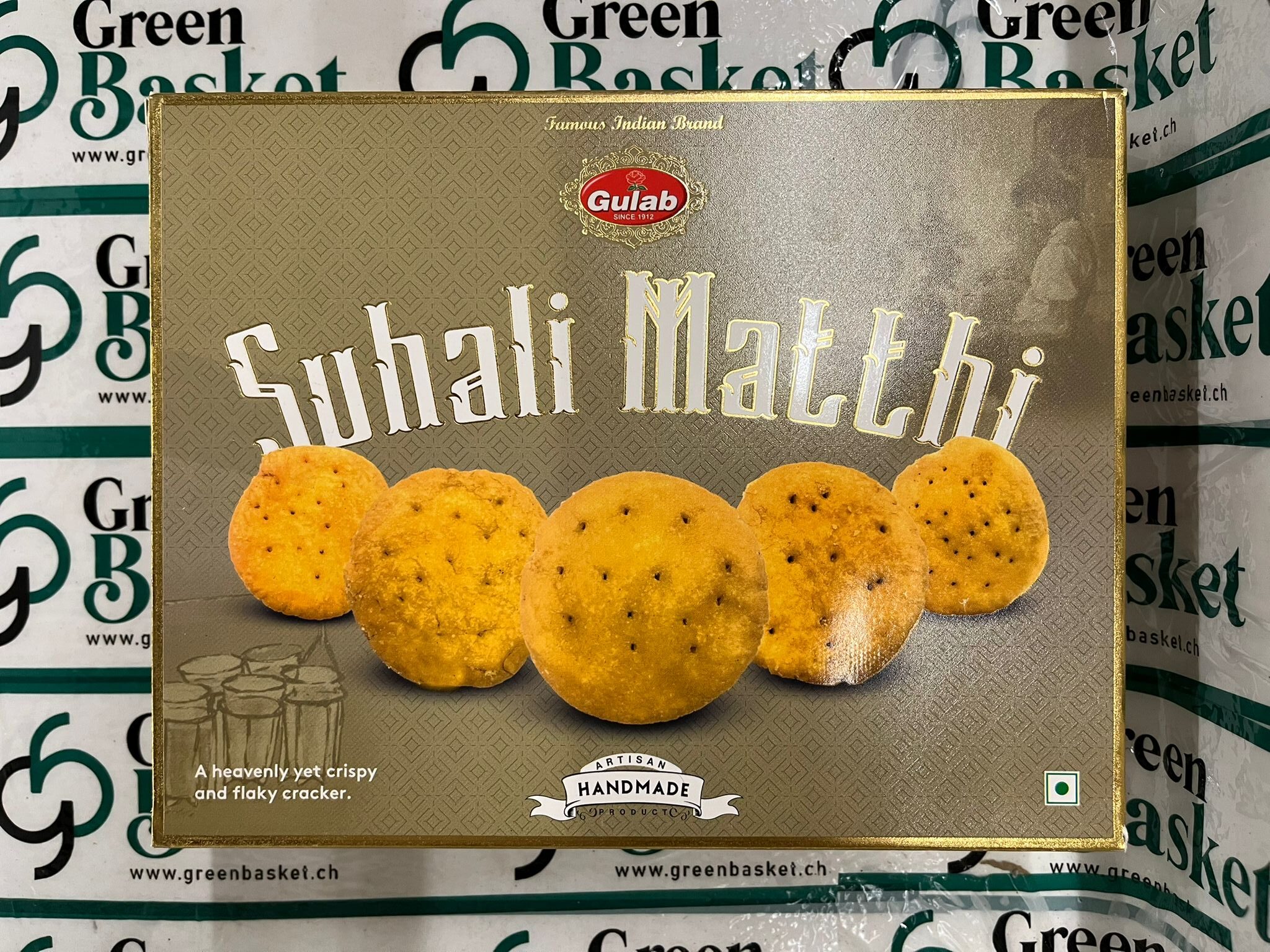 Matthi Suhali von Gulab ist ein Snack, der nach einem traditionellen nordindischen Rezept hergestellt wird. Er ist mild gewürzt und locker. Dank seines reichhaltigen Geschmacks und seiner vielschichtigen Textur ist er der ideale Begleiter zu Chai oder Pickles. Er ist ein Muss für Feste oder den täglichen Genuss.
